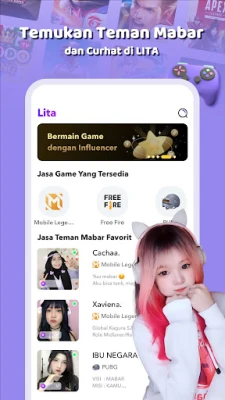 Lita, aplikasi teman mabar terbesar di Indonesia. Gabung dengan ribuan gamer jago dan cantik untuk push rank atau on mic langsung bersama idola pro player/Youtuber impianmu. Cari teman baru dan tingkatkan pengalaman bermain game-mu.